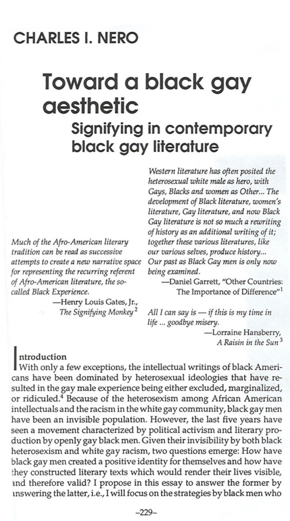 "Toward a Black Gay Aesthetic: Signifying in Contemporary Black Gay Literature", explores how Black gay literary voices negotiate race, sexuality, and cultural tradition, especially in the context of Afro-American literary history.